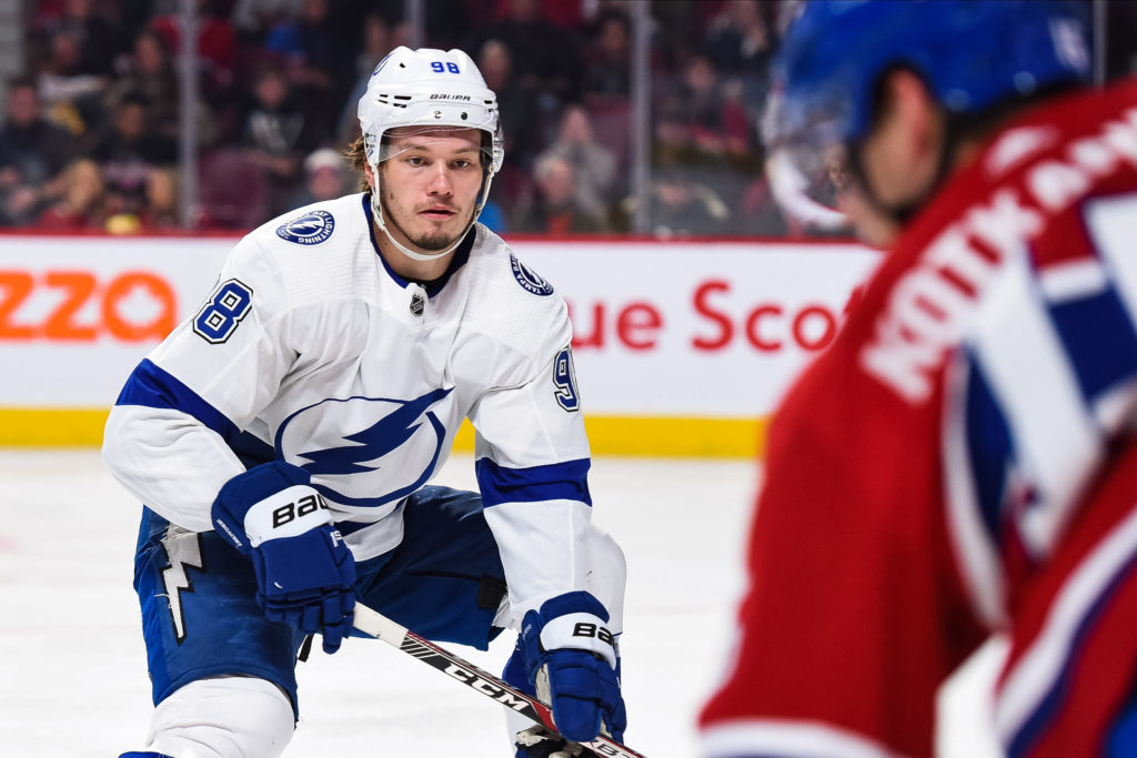 MONTREAL, QC – JANUARY 02: Look on Tampa Bay Lightning defenceman Mikhail Sergachev (98) during the Tampa Bay Lightning versus the Montreal Canadiens game on January 02, 2020, at Bell Centre in Montreal, QC (Photo by David Kirouac/Icon Sportswire via Getty Images)